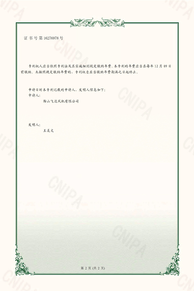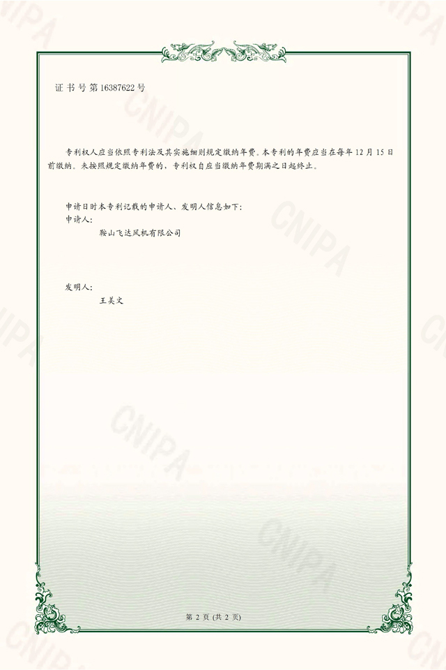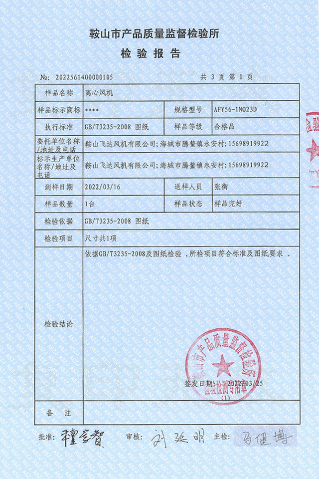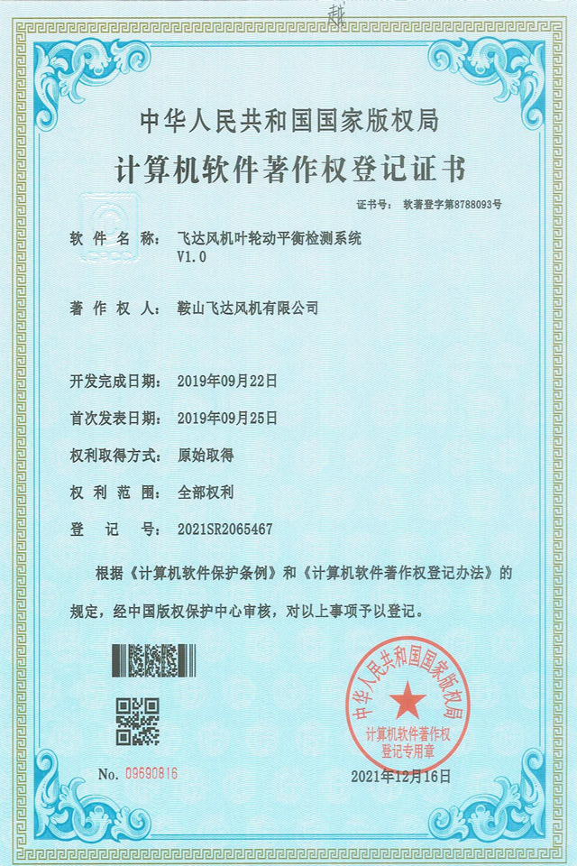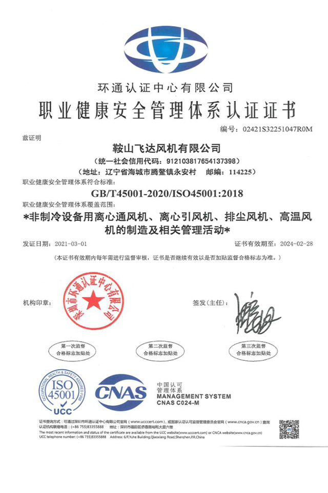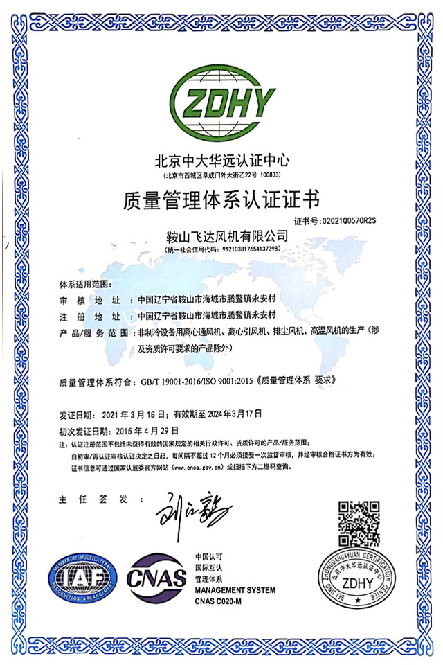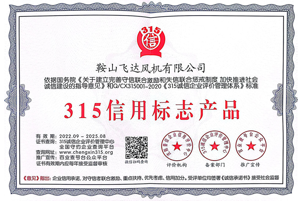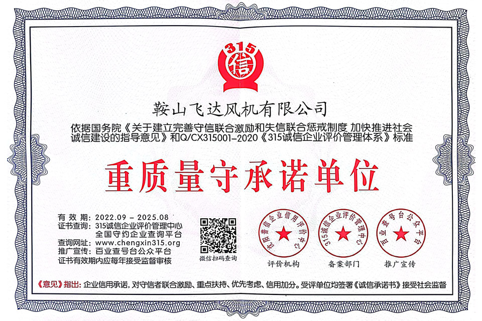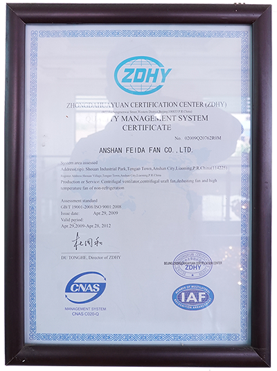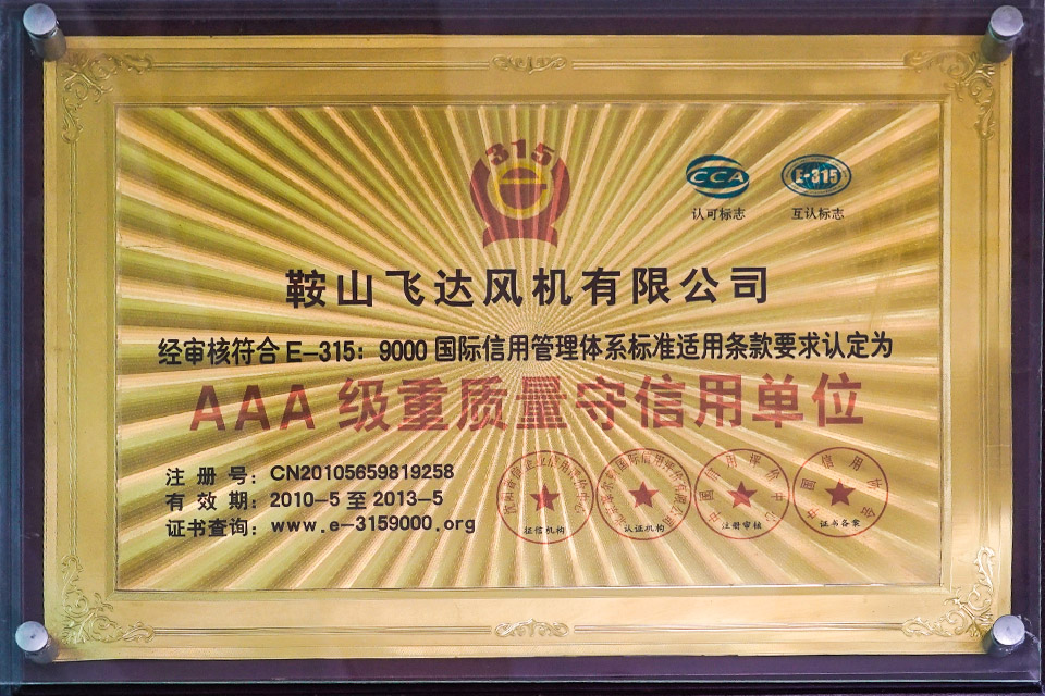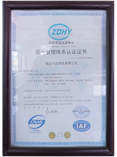 飛達(dá)風(fēng)機(jī)產(chǎn)品通過3C認(rèn)證、CE認(rèn)證,工程風(fēng)機(jī)通過消防鑒定,并取得了ISO9001:2000國際質(zhì)量體系認(rèn)證。